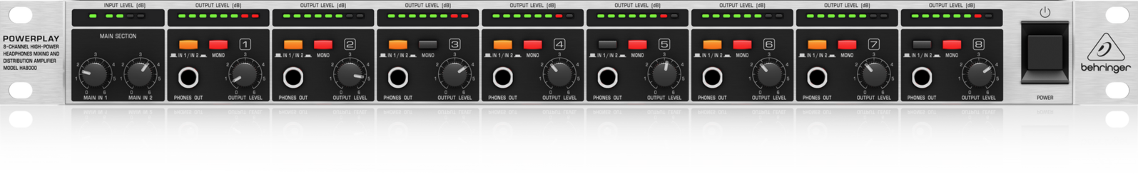 An articulate headphone mix can make all the difference in the outcome of a recording session. The 8-channel POWERPLAY PRO-8 HA8000 features superior performance, routing and mixing functions to accommodate even the most discerning set of ears. Two independent stereo Main Inputs, along with a dedicated Direct Input on each channel allows individual performers to obtain a more customized monitoring mix.
