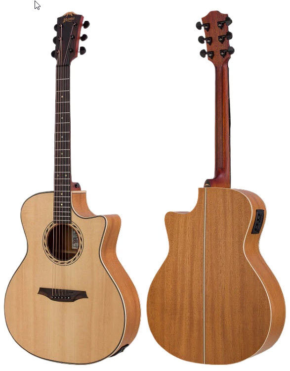 Experience exceptional sound and craftsmanship with the Bromo Tahoma Series Grand Auditorium electric-acoustic guitar. Finished in natural satin with a Venetian cutaway, it features a solid spruce top, mahogany back, and sides enhanced by patented ToneFlow bracing for rich, balanced tone. Maple multi-layer bindings and a center back strip add elegant detail, while the premium mahogany neck, reinforced with Amara ebony strips and a two-way truss rod, ensures lasting stability. The Amara ebony fingerboard, adorned with eagle eye abalone inlays, offers smooth playability across 20 jumbo frets. Equipped with a sophisticated BZP1 4-band EQ preamp, LCD chromatic tuner, and piezo under-saddle pickup, this guitar delivers versatile, professional-grade sound control—making it the perfect choice for serious musicians.