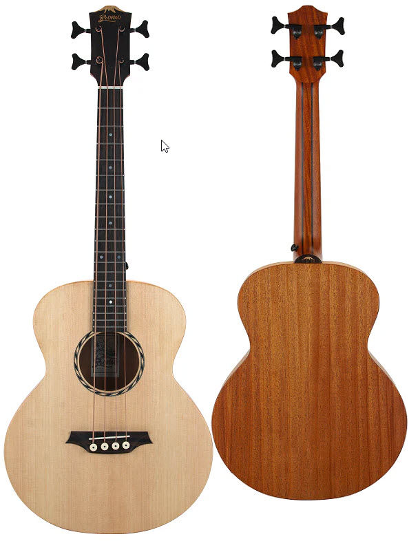 Bromo Guitar Tahoma Series Mini Jumbo Electric/Acoustic Bass Guitar. Solid spruce top, mahogany back and sides. Premium 5 piece head through heel mahogany neck with two Amara ebony reinforcement strips for increased stability and 2 way truss rod. Amara ebony fingerboard with mother of pearl dot inlays. 20 jumbo frets. 24" (610mm) scale. Amara ebony veneered headstock with inlaid maple Bromo logo. Maple inlaid Amara ebony veneer neck heel end. Amara ebony rope soundhole rosette. Amara ebony bridge. Genuine bone nut and saddle. Black Bromo diecast machine heads. Fishman Sonitone pickup system with soundhole mounted preamp featuring volume and tone controls. Piezo under-saddle pickup.9 volt battery. Supplied with padded gig bag. Natural satin.