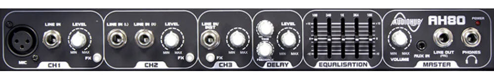 Designed with flexibility in mind the AH80 can accommodate a variety of input options such as XLR, Jack or RCAs. Two independent channels with a dedicated three band EQ on each to give you plenty of tonal possibilities. An On-board Digital Delay with Feedback, Time & Level controls with individual channel assigns gives you the ability to add a bit of character to each of the channel inputs, an AUX/CD input – 3.5mm stereo jack and finally a DI out completes the front panel features. Add to this an FX loop on the rear panel and you have every base covered. Housing a 1 × 10” custom driver and an HF horn, the AH80 pumps out 80 watts RMS.